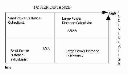 These terms need some further explanation. "Power distance" refers to the relative degree of equality between persons holding different levels of authority in an organization. In a culture with a large power distance, such as the Arab culture, a boss would treat an underling as very much beneath notice; an American would treat that individual as more of "team member."