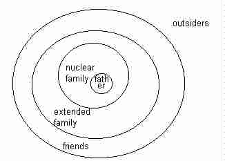 In order to understand this drawing requires working outward from the center. Within a nuclear Arab family, the father remains the key figure. Often considerably older than the mother, the father retains all authority (Patai: 1973; Cowan: 1987). Less than 15% of all Myrri women actually work and take a subordinate role in society. In most family decisions, the father decides, and children listen rather than debate with parents. Fathers often determine such matters as a young man's career and the girl he marries (Marr: 1987).