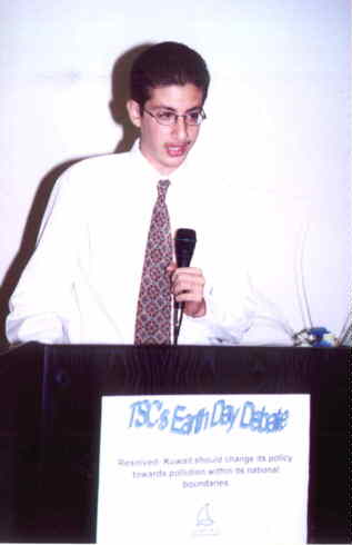 "What do we do when man attacks his own environment? Does the sky above Kuwait belong to Kuwait alone? How do we prevent man from committing brutality against the planet? These are some of the issues we must consider as the teams tonight debate the statement 'Kuwait should change its policy towards pollution within its national boundaries.'"