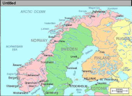 The Kingdom of Norway is located in Northern Europe occupying the western and northern portions of the Scandinavian Peninsula. Norway is bordered on the north by the Barents Sea, an arm of the Arctic Ocean, on the northeast by Finland and Russia, on the east by Sweden, on the south by Skagerrak Strait and the North Sea, and on the west by the Atlantic Ocean, which in Norway is also called the Norwegian Sea. The Norwegian coastline extends about 2740 km including all the fjords and offshore islands, the coastline totals about 21,200 km. The islands, known locally as the skerry guard, form a protected waterway along the coast. Norway has an area of 323,877 sq. km. Oslo is Norway's capital and largest city.