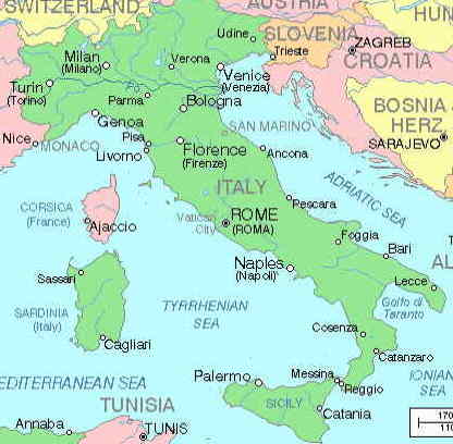 Italy is located in Southern Europe, a peninsula extending into the central Mediterranean Sea, northeast of Tunisia. The geographic coordinates are 42 50 N, 12 50 E. The total area that Italy covers is 301,230, sq km, land coves 294,020 sq km, and water covers 7,210 sq km this is including Sardinia and Sicily.