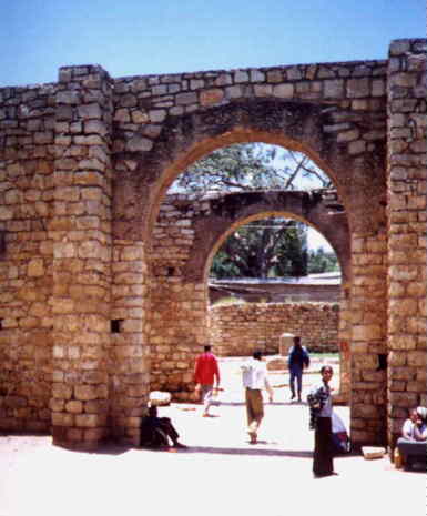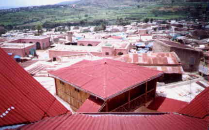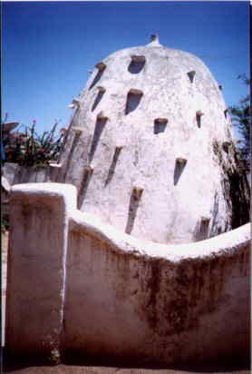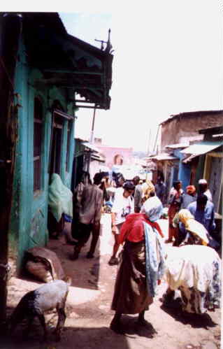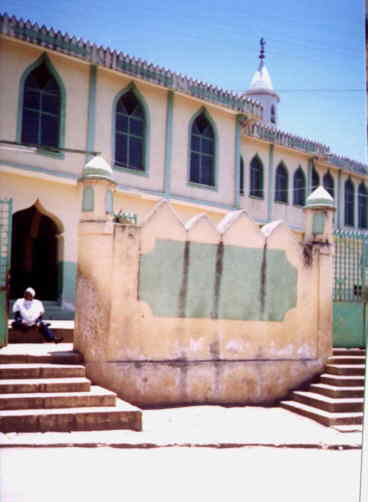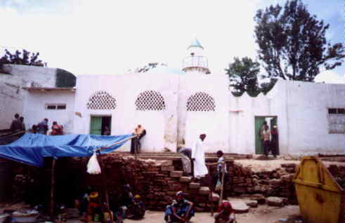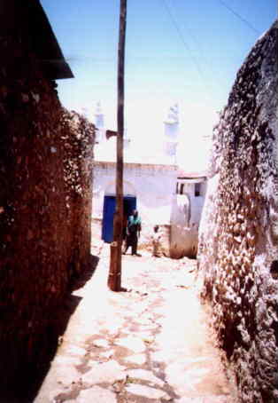 Harar and, indeed, the Eastern provinces of Hararege slipped away from Ethiopia with the rise of Islam. In fact, geography had never made Harar a part of Ethiopia. The heartland of Medieval Abyssinia lay in the mountains of the North, and Harar lay on the other side of the Great Rift valley on fairly flat lands, closer historically and culturally to the Moslem States that dominated the Red Sea trade after the death of Axum. Typically Harar formed the capital of the Sultanate of Adal. It neighbored other Moslem states, including those of the Somalia and the Djibouti. However, the Moslem states often spent more time quarreling with each other than the Christians and, again, the Prophet did not authorize any jihad against the Ethiopians. All of this changed with the rise of Ahmad Gragn who became Amir of Harar and the chief of the Adal (Afari) tribes. In 1528, with an army of 16,000, he invaded the highlands aided by Turkish mercenaries and artillery. A devout Moslem, he devastated not only the Christians but their places of worship, the monasteries and churches. Called "Gragn," the left-handed, his invasion gave little quarter to the Chrisians. The Christian king, on his side, used Portuguese troops and the two sides foughts ferociosly, the Abssyinians, the Northerners, for the survival of their culture and relgion and Grazni for that of his own. After the death of both kings,the Christians drove the Moslem out of the highlands. However, the cost to both sides was so heavy that pagan Oromo tribes managed to invade both Moslem and Christian territories to become a part of the cultural mix of Ethiopia. Until recently, Harar remained independent of Ethiopia. Ras Makonnen here, as elsewhere, arrived as 19th Century conquerer and his statue stands a number of places. In the last two generations various Ethiopian peoples arrived in Harar so that the population is not exclusively Moslem. Less than spectacular Mosques notwithstanding, Harar is considered the third most holy city in Islam after Mecca, Medina, and Jerusalem. It's also a symbol of the Moslem presence and influence on modern Ethiopia.