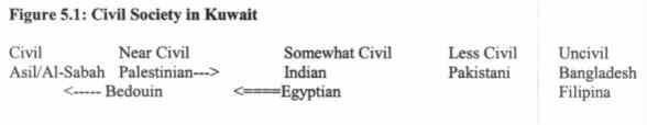 The resulting "civil society" in Kuwait much depends upon the nationality rankings mentioned in the previous chapter. For instance, one can rank the communities within Kuwait, roughly speaking, on their cohesion as tribes in the Arab sense and on their largely corresponding ability to support a civil society. Consider the following as a "civil society" scale or, alternately, as a means of describing the completeness of the tribes depicted: