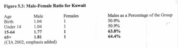 This led, of course, to the common practice among employers of taking the foreigner's passport. With that in hand, Asil felt at least some control of the foreigners working directly under them. However, this did not totally take away the feeling of fear from foreigners (Al-Ramadhan & Russell, 1995). Even for those not actually sponsoring foreigners, the fear of the presence of these foreigners grew, especially a female fear of "single" males. Actually many of these so-called bachelors (70%) had a family left behind. Still this left a population in Kuwait of over sixty percent male and predominantly adult males. Current populations statistics (CIA, 2002) reflect this gender imbalance: