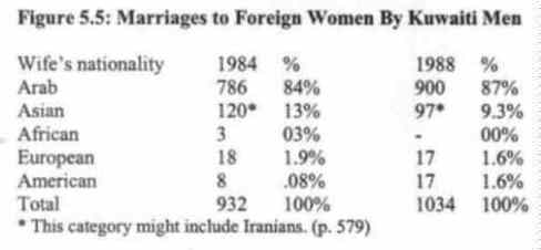 This fear bears further discussion. Kuwait University students conducted no fewer than three studies on the subject of Kuwaitis marrying foreigners, some sign of its fascination. The figures below show how seldom this actually occurred (Al-Thakeb, 1985).