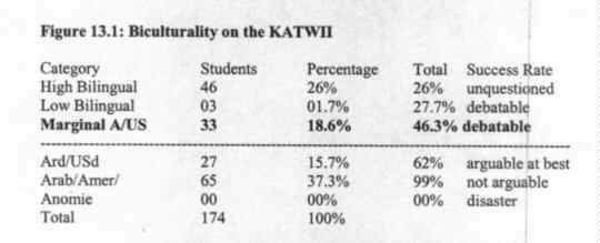 Generally, the KATWII offers some initial indications as whether Al-Dharra Madressor students show a secondary Western cultural proficiency. Relatively few students fall into the category of bicultural even when including those in the category of Low Biculturals. Adding in the additional, mainly Arab-oriented, marginal students only yields a total of about half of the students, 46.3%.