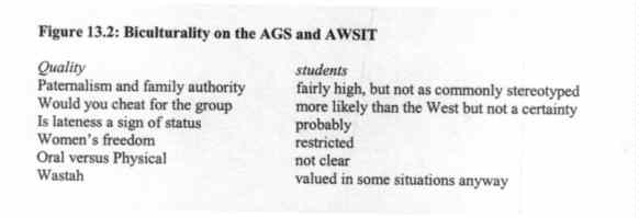 In the interview contexts, student choices underlined their much greater adherence to Arab cultural norms than Western. Thus, the responses to the Arab situations remained reasonably well aligned with those of the Arab staff. In the American situations on the AWSIT also students more typically chose Kuwaiti, not American, responses. In this respect, again, one needs to recall the variation of cultural norms in America that allows a great variety of cultural responses, and the students’ answers do not totally lie outside the rather loose boundaries for "acceptable" behavior. Hence, many immigrant parents in the US would express the same reservations about children leaving the family, girls going on dates, etc. as would the students studied. The students could probably live "American" with the same degree of ease as Bosnian-Americans, Ethiopian-Americans, or Mormon subcultural groups. Personal observations by this author of Kuwaitis’ behavior in other social contexts heavily support the conclusions reached here and appear in chapter fourteen.