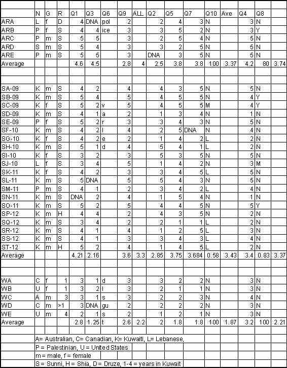 1. Unlike your family, your cousin's family recently had some financial problems. Their daughter, Noor, still wants to go to the University. She comes visiting with her family and hints that she needs financial help. [K, Y, OS] 2a. (student version). After finishing school in the UK, a professor tells you that a company in the UK wants to hire you and offer you a two-year-contract. 2b. (adult version). A departing teacher will soon become director at a school in another country. He invites you to come along with him for a two-year-contract. [Am, Y, OS] 3. Abdullah laughs when he hears someone say that Mohammed may fail a required class. "Are you kidding," he says, "with all of his wastah, he'll never fail." [K, T, S] 4a. (student version). Sheika, a friend, has written all of the answers down to the test on a piece of paper which she wants to give to you. "Mr. A will check me. Give it back when we get inside." 4b. (adult version). Your neighbor teacher, Ms. A, claims she must leave this afternoon to attend a conference at her daughter's school. "If anyone asks for me, tell him I'm at the library." Ten minutes later, the principal arrives asking for A. [Ei, Y, S] 5. Mr. A says, "When I reached eighteen, I told my father 'Hey, it's my life, and I will do what I want.’" [Am, T, OS] 6. Two cars collide, and the men inside get out. After threatening and almost screaming at each for ten minutes, while the other men hold them back, the two men get back in their cars and drive away. [K, T, OS] 7. Noor and Abdullah are not related to one another, but Noor holds hands with Abdullah and says, "He's my boyfriend." She explains the date she spent with him the previous week. [Am, T, S] 8a. (student version). After a long conversation with your brother, you realize that at the University he is spending all of his time hanging around with Kuwaitis. 8b. (adult version). After a long conversation with your son, you realize that at the University he is spending all of his time hanging around with people of the same race [Western]/nationality [Arab]. [Ei, Y, OS]9a. (student version). After agreeing to let you go on a much-anticipated student trip, your father suddenly forbids you to go. 9b. (adult version). After hearing your child talk for months about the upcoming school trip, suddenly you hear some information which gives you some serious concerns about the trip. [K, Y, S] 10a. (student version). Your class started at 7:20. It's now 8:00, and you're coming to the door. 10b. (adult version). Your new boss wanted you in the office at 7:20. It's now 8:00, and you're coming to the door. [Am, Y, S]