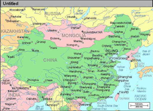 China lies in Eastern Asia it is bordering the East China sea, Korea Bay, Yellow sea, and South China sea. China is found between North Korea and Vietnam. It is only a little smaller than the US and its area is 9,596,960 sq. km; therefore, being the fourth largest country in the world. It shares borders with 16 countries: Afghanistan, Bhutan, Burma, Kyrgyzstan, Northeast and Northwest Russia, Laos, Tajikistan, Macau, Mongolia, Nepal, Hong Kong, Kazakhstan, India, Pakistan, Vietnam, and North Korea. On the border by Nepal, China shares the highest peak in the world Mount Everest. In the south China is tropical, but in the North, it is sub Arctic. China is mostly mountains, has high plateaus, some deserts in the west, has plains, deltas, and some hills in the east.