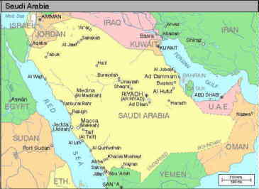 Saudi Arabia is located in the Middle East, bordering the Persian Gulf and the Red Sea, north of Yemen. Its geographic coordinates are 25 00 N and 45 00 E. Its total area is 1,960,582 sq. km, land area 1,960,582 sq. km, and water area is 0 sq. km. Saudi Arabia’s slightly less that one-fourth the size of the US. Its border countries are Iraq, Jordan, Kuwait, Oman, Qatar, UAE, and Yemen. A large section of boundary with Yemen is not defined, the status of boundary with UAE is not final, and the Kuwaiti ownership of Qaruh and Umm al Maradim islands are disputed by Saudi Arabia. The coastline is 2,640 km. The climate is harsh, dry desert with great extremes of temperature. Thus, the terrain is mostly uninhabited, due to sandy deserts. The lowest point of elevation extremes is the Persian Gulf, 0 m, and the highest point is Jabal Sawda’, 3,133 m. Saudi Arabia’s natural resources are petroleum, natural gas, iron ore, gold, and copper. Its land is 1% arable land, 0% permanent crops, 39% meadows and pastures, 1% forest and woodland, and 59% other. It’s irrigated land is 4,350 sq. km.