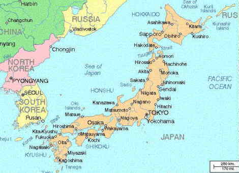 Japan is located in Eastern Asia, island chain between the North Pacific Ocean and the Sea of Japan, east of the Korean Peninsula. Japan also has some islands known as the Bonin Islands; (Ogasawara-gunto), Daito-shoto, Minami-jima, Okino-tori-shima, Ryukyu Islands (Nansei-shoto), and Volcano Islands (Kazan-retto). Japan has no boundaries. The climate there varies from tropical in south to cool temperate in north. The terrain there is mostly rugged and mountainous. The lowest point of elevation is Hachiro-gata; 4m, the highest point is Fujiyama; 3,776m. Note that Japan has a strategic location in northeast Asia. Japan is also mainly known for its mountainous terrain, where there is only some flat plains.