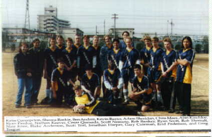 On Saturday YHS's j.v. boys' team completing its WINNING season with a 2-0 victory of Zama j.v. This leaves YHS B with probably the second best record of all the j.v. teams in the Kanto Plains. Forward Blake Anderson scored as did midfielder Karl Pederson while Scott Nemoto and Scott Teal each registered an assist. Goalie Alan Kinchloe played a gusty game in route to the victory. Please congratulate the following permanent member of the 1998 YHS B team on their sucessful season: